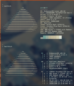 – Arch-pohjaiset: sudo pacman -S fastfetch